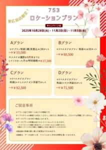 8月末までに七五三の前撮りをしていただいた方には、秋に開催のロケーションプランを特別価格でご案内いたします💕