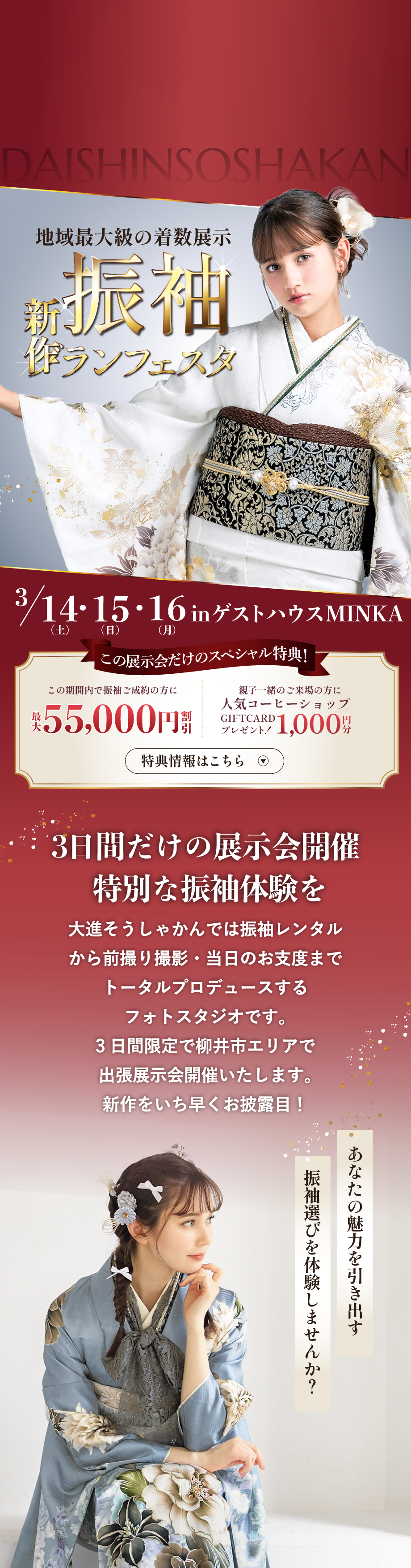 当日でも空きがあればご案内可能です。 ただ、会場が混み合った際、ご予約のお客様を優先的にご案内させていただくため、お待ちいただく場合がございます。WEBからの事前予約をいただければ、お待たせすることなくスムーズにご試着いただけ、さらに「事前予約特典」もプレゼントしておりますので、ぜひご予約の上お越しください。振袖見学予約はコチラ