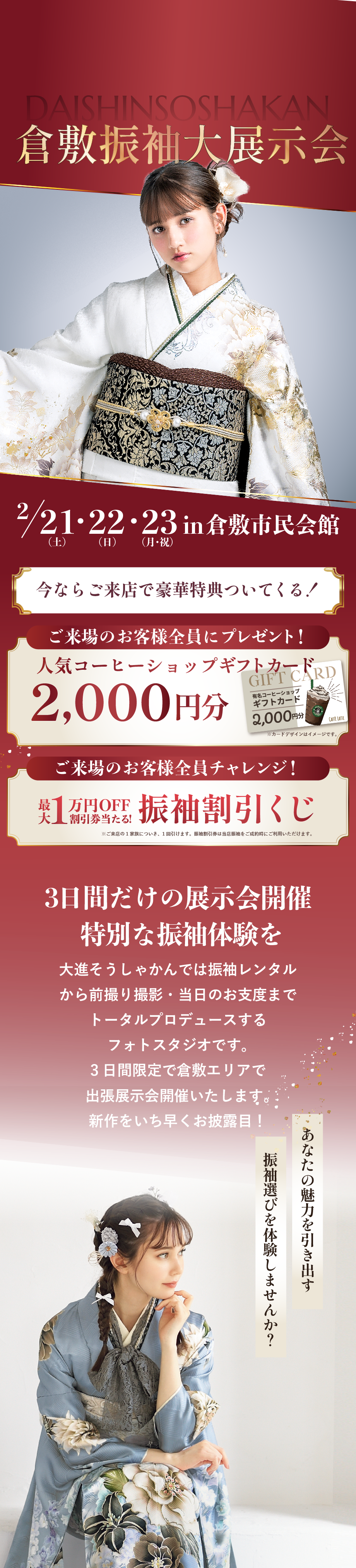 当日でも空きがあればご案内可能です。 ただ、会場が混み合った際、ご予約のお客様を優先的にご案内させていただくため、お待ちいただく場合がございます。WEBからの事前予約をいただければ、お待たせすることなくスムーズにご試着いただけ、さらに「事前予約特典」もプレゼントしておりますので、ぜひご予約の上お越しください。振袖展示会見学予約はコチラ