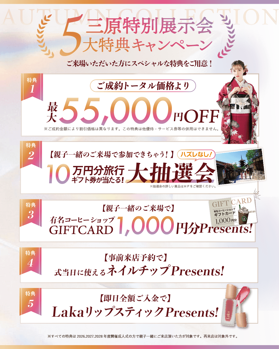振袖選びは今がチャンスです!親子一緒のご来場ですと、さらに特典盛りだくさんついてくるのでぜひお越しください!🏃