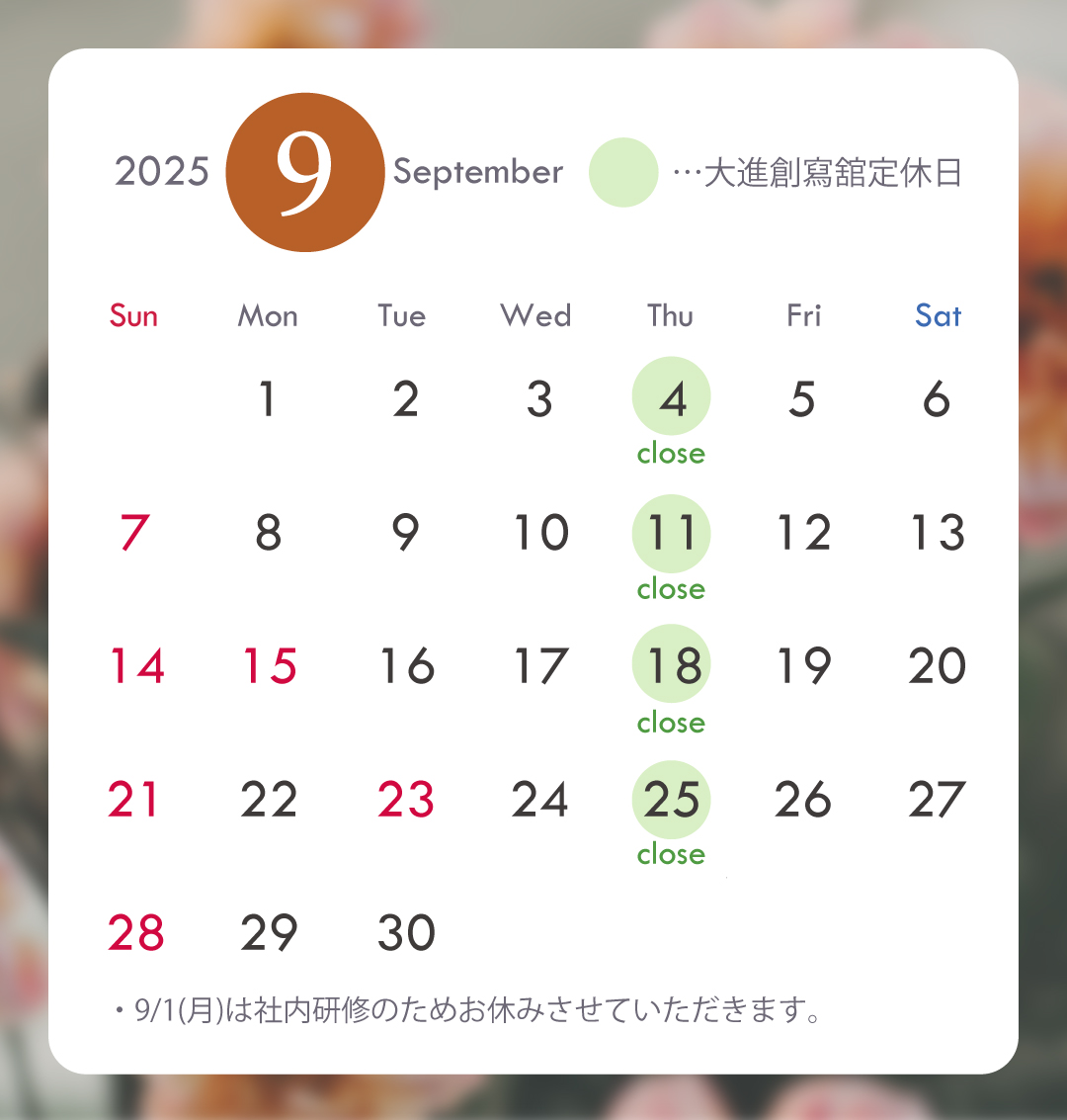 ※9月1日(月)は終日社内研修のためお休みとさせていただきます。