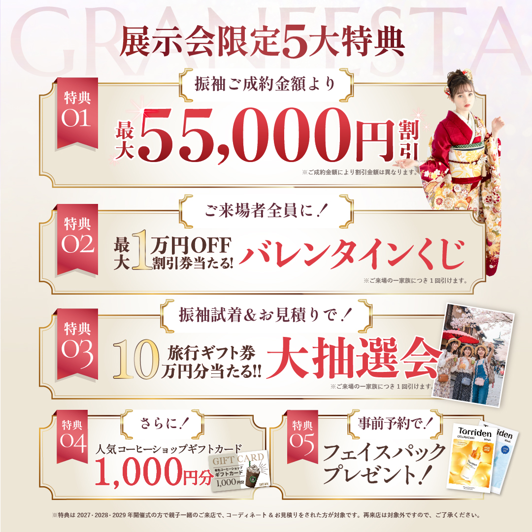 冬の新作振袖が一堂に大集結!この期間限定のお得な割引と豪華特典がついてくる!
