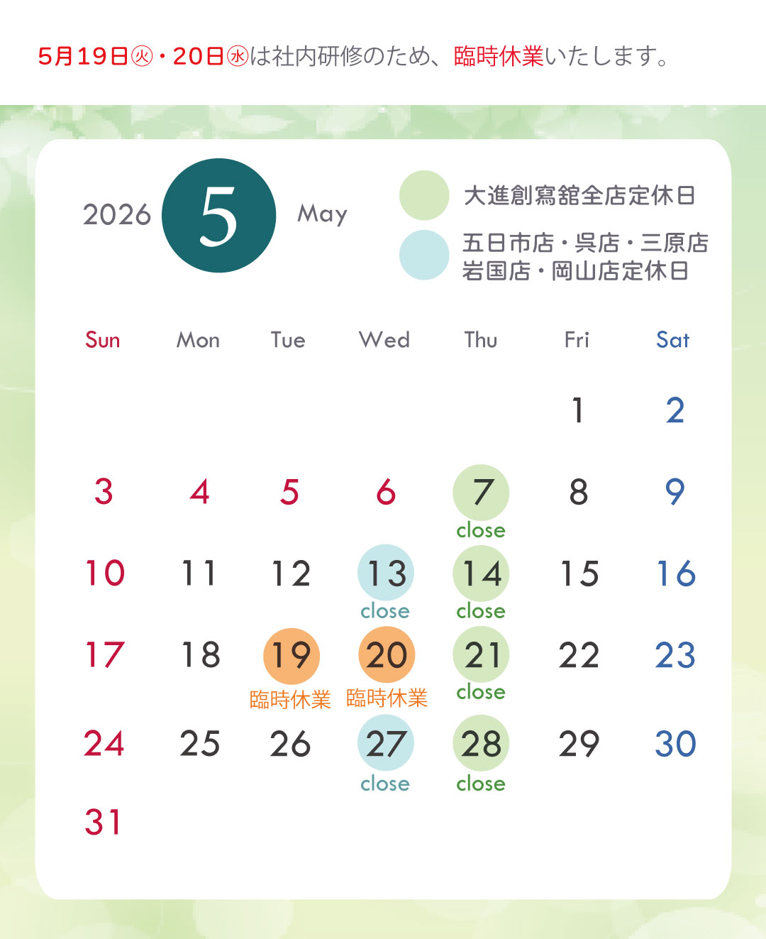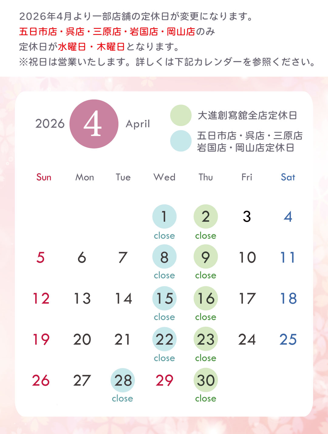 2026年4月・5月は下記の通り、営業させていただきます。