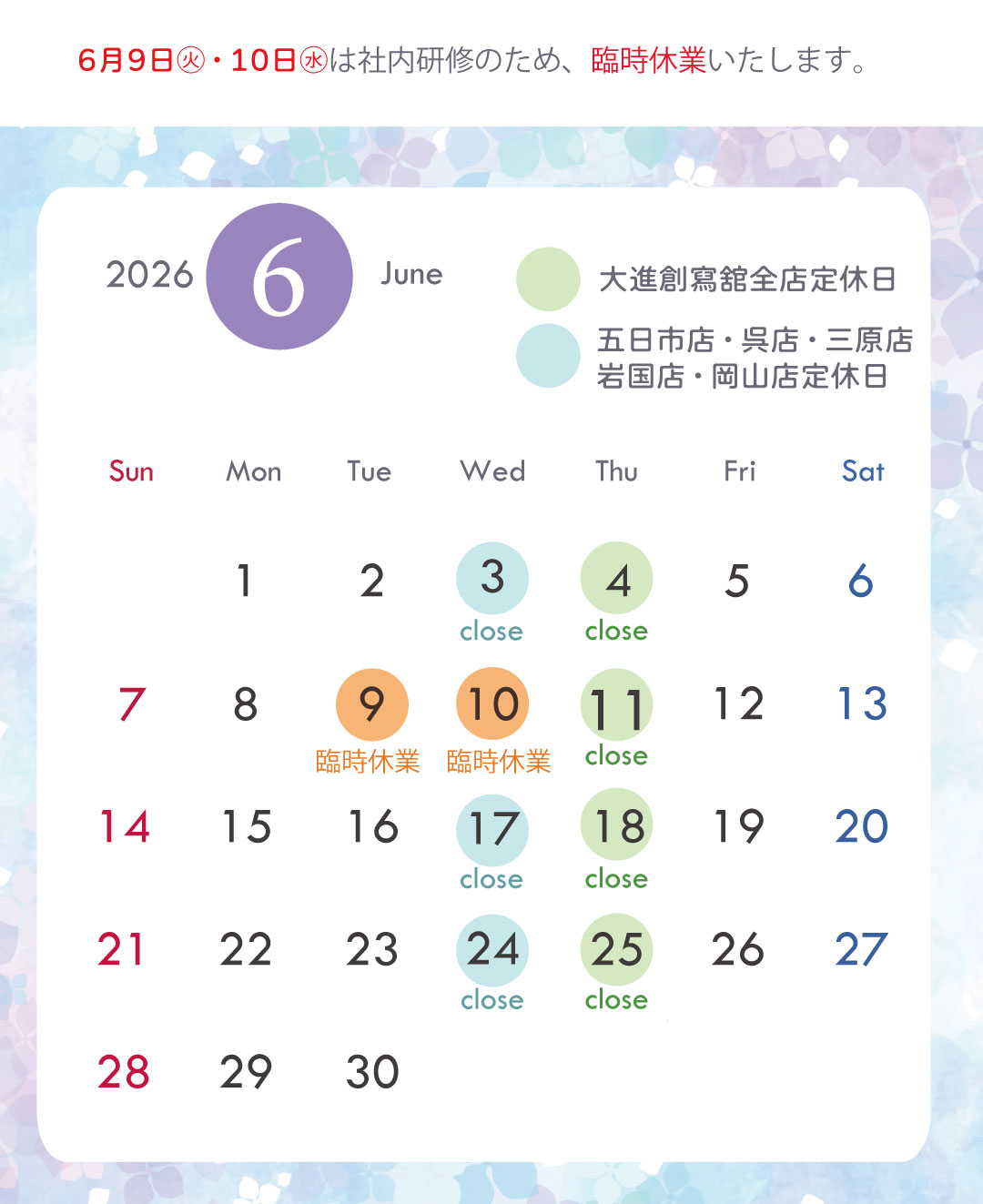 2026年5月・6月は下記の通り、営業させていただきます。