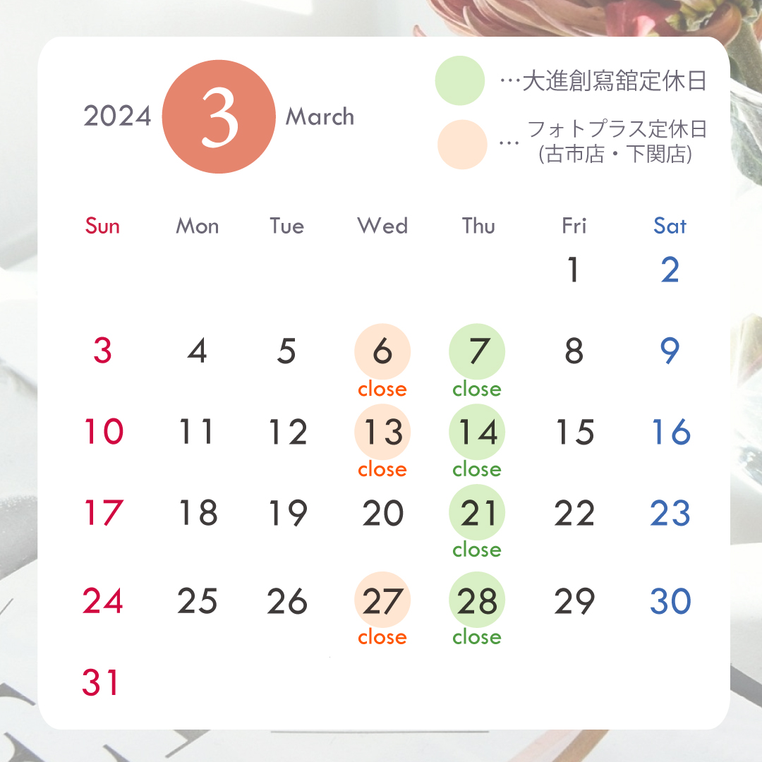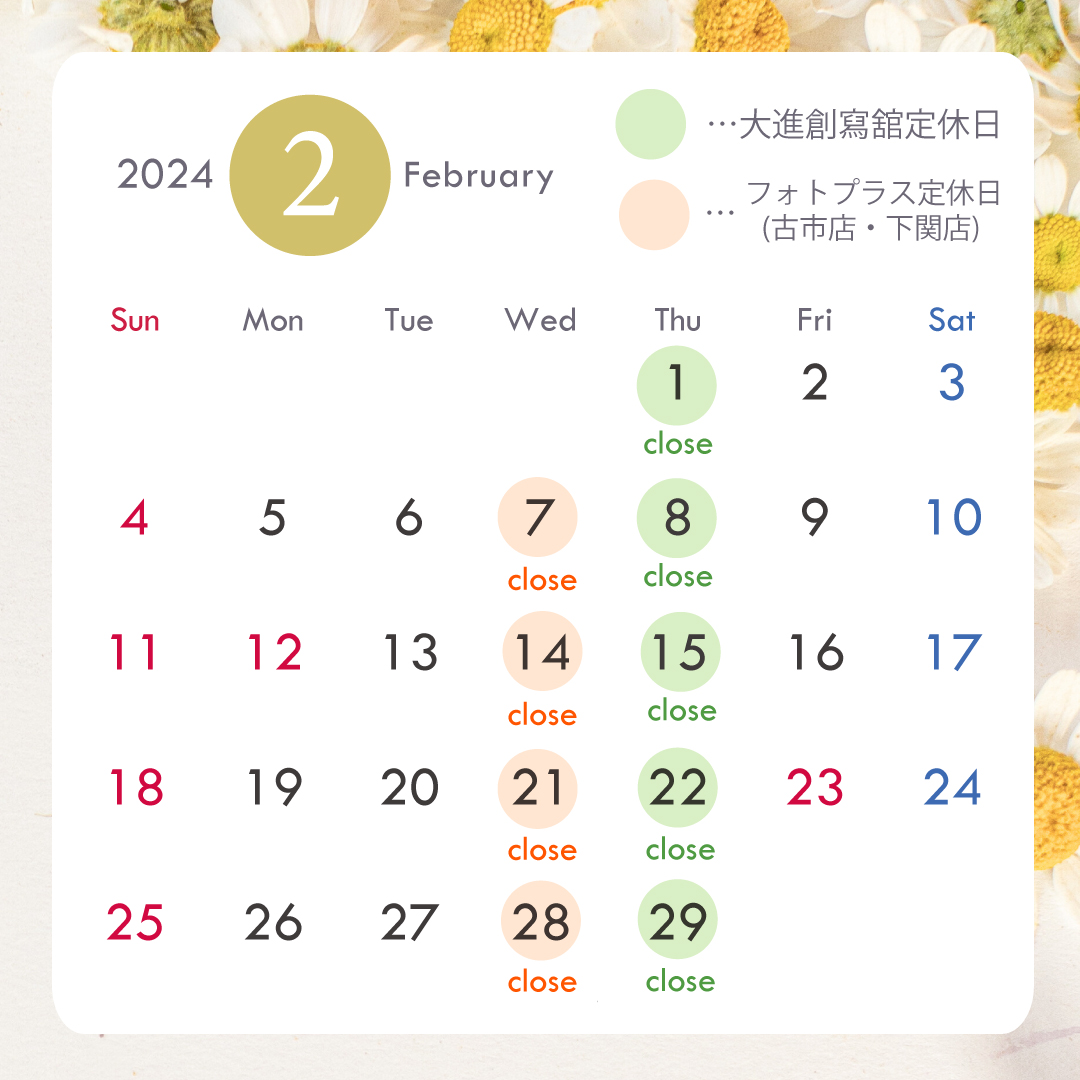 お客様各位 平素より大進創寫舘・フォトプラスをご利用いただき、誠にありがとうございます✨ 2024年2月・3月は下記の通り、営業させていただきます。